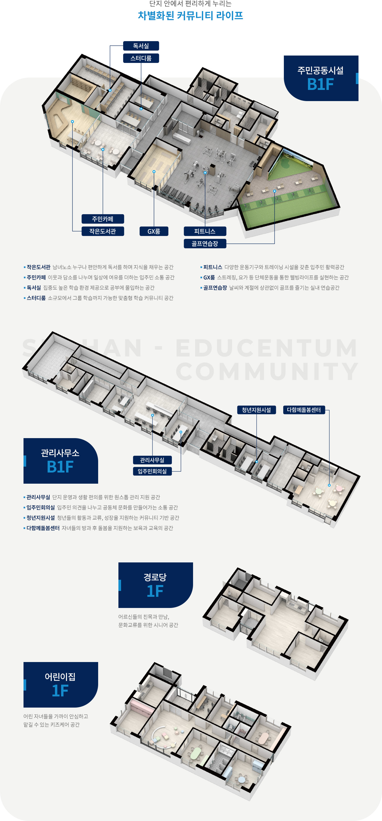 - 상기 커뮤니티 GC는 소비자의 이해를 돕기 위해 제작된 것으로 실제와 다를 수 있으며, 시설의 구성, 명칭은 사용상의 편의를 위 한것으로 추후 변경될 수 있으며, 이미지상의 집기 및 기기, 수량 등은 소비자의 이해를 돕기 위한 연출용으로 실제 시공 시 변경될 수 있습니다.
