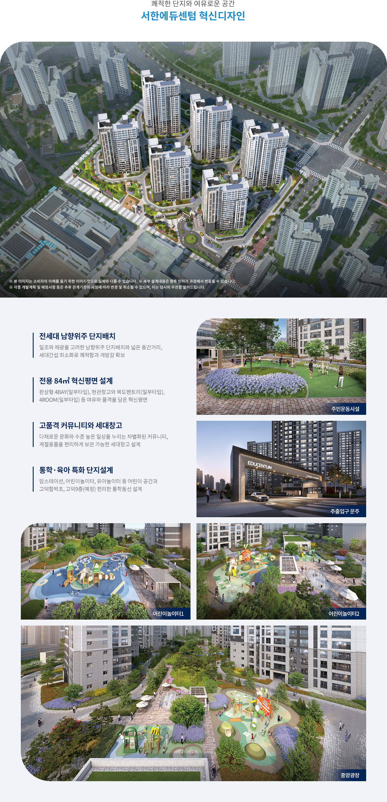 - 단지 외부 식재, 도로, 주차장, 소공원 및 각종 시설물 등은 지자체 및 공사를 주관하는 사업체의 사업개발계획에 의해 변경, 지연, 취소될 수 있으며, 이는 당사와 무관합니다.